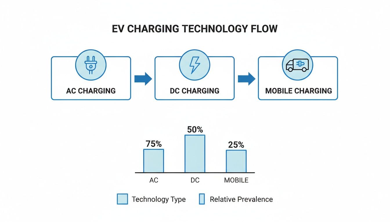 DC Charging (Rapid to Ultra-Rapid): This is the high-power solution for public charging hubs and commercial fleets where time is money. Rapid DC charging starts at 50kW and can add around 100 miles of range in about 30-40 minutes. Ultra-rapid chargers take things to another level, delivering 150kW or more and cutting that time down to as little as 10-15 minutes for a similar boost. To really get into the weeds on this, you can explore our ultimate guide to rapid EV charging.