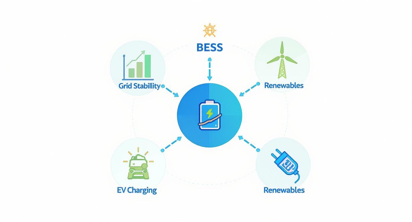 It is like filling a huge water tank with a small hose. It might take a while but once full, you can open a massive valve and release a powerful gush of water instantly. A BESS does the exact same thing with electricity, accumulating power steadily and then unleashing it in high-speed bursts to charge several EVs at once.