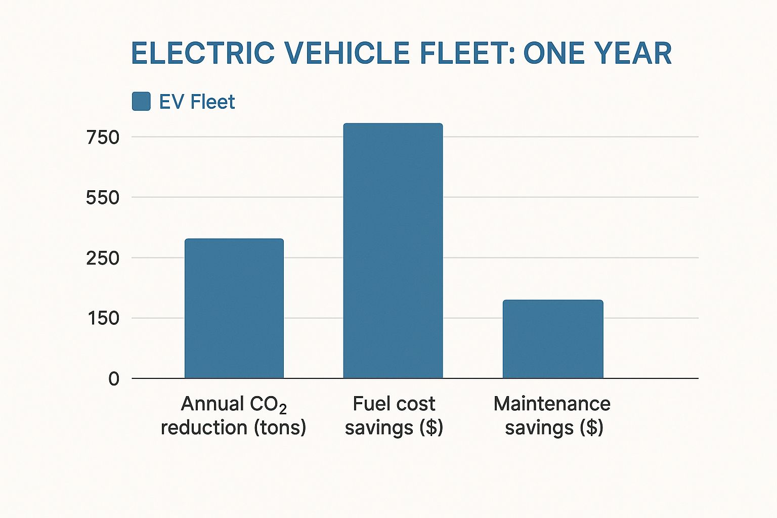 As you plan your infrastructure, it helps to keep the end goal in mind. The infographic below shows the very real financial and environmental wins a well-planned electric fleet can deliver in just one year.