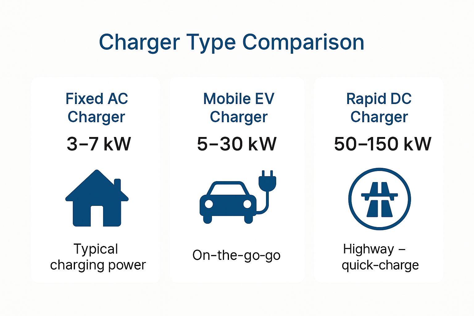 Each type plays a vital role in the EV ecosystem. Fixed chargers provide the everyday background charging, mobile units fill the gaps and rapid chargers make long-distance electric travel a practical reality.