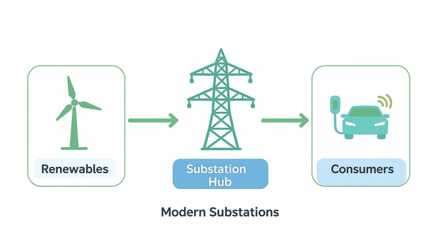 This visual shows the seamless flow of energy from on-site renewables through a smart substation hub to end-users like EV chargers.