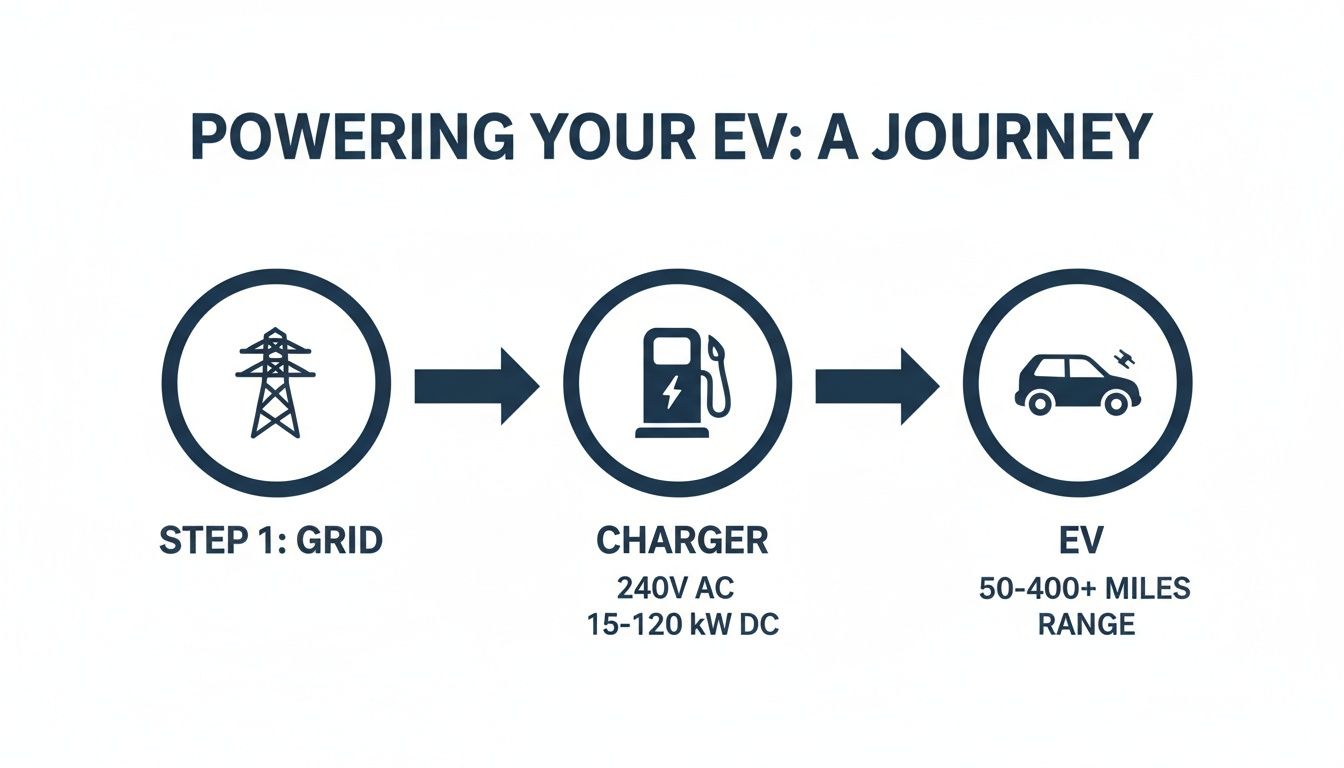 This visual breaks down the entire process into three core stages, showing how the charger acts as the critical go-between, connecting the vast power grid to your car's battery system.