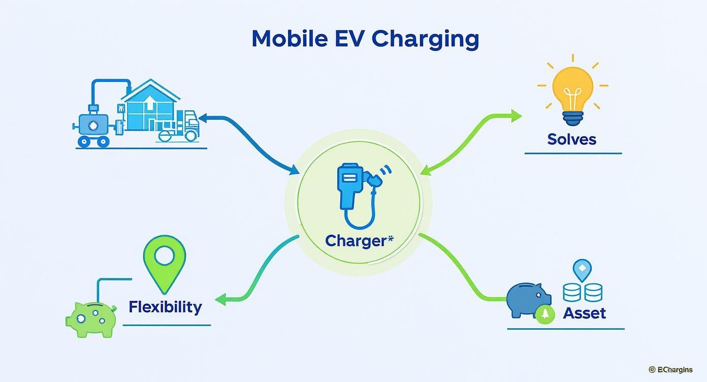 This is where a mobile EV charger offers an elegant workaround. It can be left to trickle-charge overnight from a standard industrial supply, quietly storing up energy. Then, during that critical early morning turnaround, it can deliver simultaneous rapid charging to multiple vans, getting the entire fleet out on the road on schedule. This kind of operational agility is a game-changer and for anyone managing large fleets, understanding the ins and outs of EV fleet charging solutions is a complete guide to making it all work smoothly.