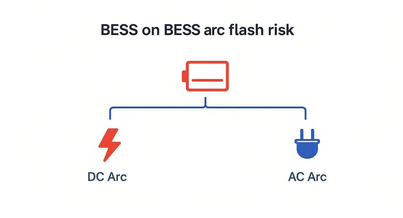 This decision tree shows how arc flash risks in a BESS can stem from either the DC or AC side of the system, each requiring its own specific protection strategies.