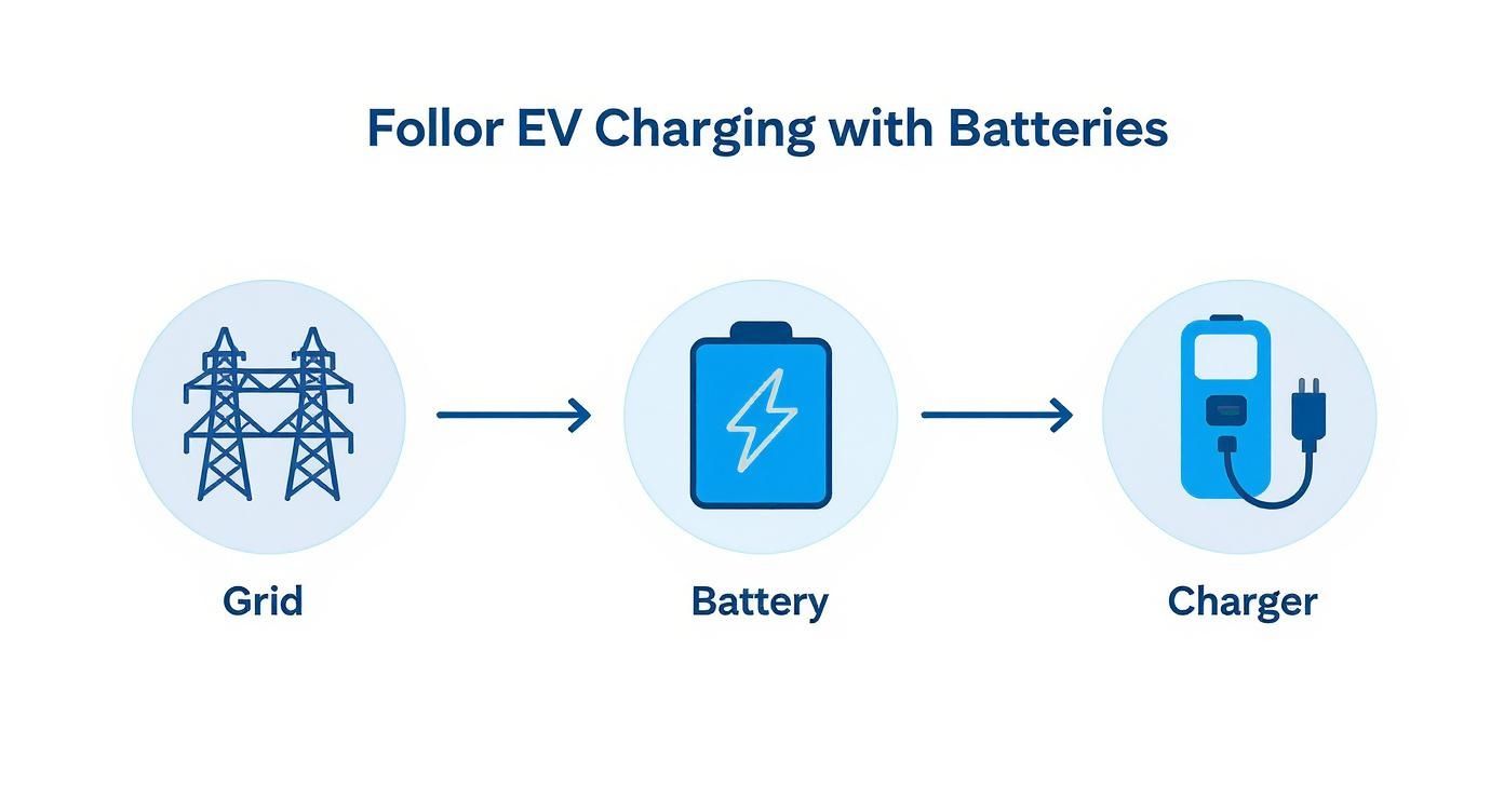 The flow from the grid to an on-site battery, and then to the charger, shows how stored energy can completely bypass grid limitations. This integration is the key to deploying high-power charging solutions without the costly and time-consuming process of grid upgrades.