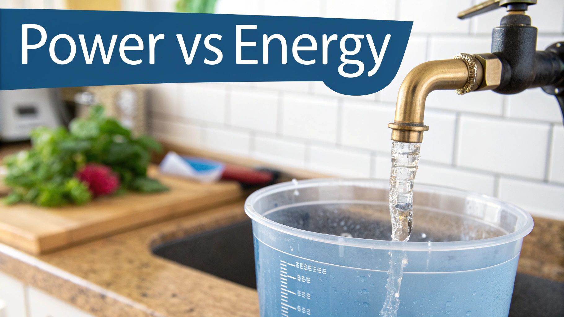 The image below breaks down this core difference, showing power (kW) as the rate of flow and energy (kWh) as the total volume consumed.