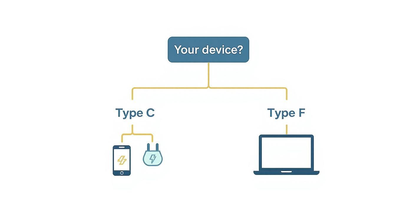 The decision tree below makes it even clearer, showing you which plug type you'll likely encounter based on the device you're using.